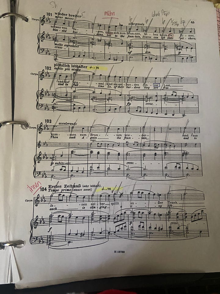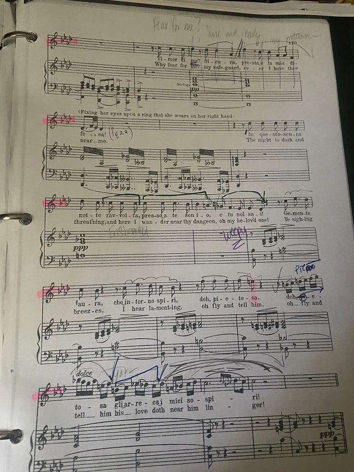 I’ll make copies of the character’s aria, mark them up fiercely and place them in my practice binder. That way I’m not dragging around several different (heavy) scores while learning different characters.